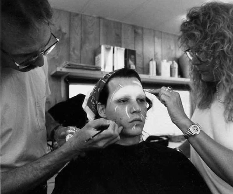 7. Each day, Edwards’ make-up took about an hour and 45 minutes to apply. (Image courtesy of http://blog.truffleshuffle.co.uk) In the shot, a young Ve Neill is seen applying Johnny’s make-up.
